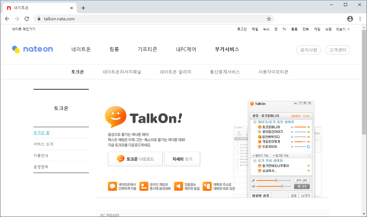 토크온 음성으로 즐기는 색다른 재미! 텍스트 채팅은 이제 그만~ 목소리로 즐기는 색다른 대화! 지금 토크온을 다운로드 하세요. 토크온 다운로드 자세히보기 특징 네이트온에서 간편하게 이용